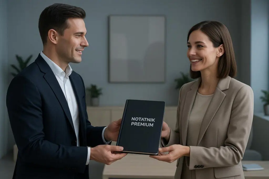 W biznesie detale mają duże znaczenie. Pracownik, który na spotkaniu korzysta z firmowego notesu, pokazuje spójność i przywiązanie do organizacji. Dla kontrahenta to sygnał, że firma jest stabilna, uporządkowana i świadoma swojego wizerunku. Taki obraz pomaga budować zaufanie, które jest podstawą trwałej współpracy.