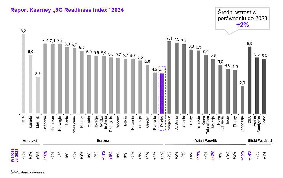 W Europie spadki wystąpiły w Szwecji, Finlandii, Norwegii, Holandii i Szwajcarii, a w miejscu stanęła Dania, Austria, Belgia i Włochy. Dobrym przykładem impasu, z którym mierzą się europejskie rynki, jest Dania. Tamtejszy regulator udostępnił niezbędne pasma, ale operatorzy nie śpieszą się z ich wykorzystaniem – częstotliwość mmWave wciąż nie jest używana, a część telekomów nie posiada rdzeni 5G w technologii standalone (SA). Nieznacznie rozwija się za to Polska, Rumunia i Czechy, które nadrabiają dystans względem liderów europejskich. Relatywnie gorsza pozycja Polski wynikała z 3,5-letniego opóźnienia w rozstrzygnięciu aukcji Urzędu Komunikacji Elektronicznej na rezerwację częstotliwości z zakresu 3,4-3,8 GHz (tzw. C-Band). Postępowanie UKE zostało rozpoczęte w 2020 roku, ale szybko zostało przerwane ze względu na wybuch pandemii. Aukcja wystartowała ponownie w czerwcu 2023 roku, a jej końcowego rozstrzygnięcia doczekaliśmy się sześć miesięcy później.Każdy z głównych telekomów w kraju (Plus, Play, Orange i T-Mobile) wylicytował dostęp do części bloku C o szerokości 100 MHz. Mimo postępów w ostatnim czasie, Polska wciąż wiele traci w porównaniu do krajów Europy Północnej i Zachodniej. Zatrzymanie rozwoju 5G w innych częściach świata daje nadzieję, że czołówkę uda się dogonić, ale powinniśmy brać przykład z Hiszpanii, Wielkiej Brytanii i Portugalii, które rozwijają się szybciej.